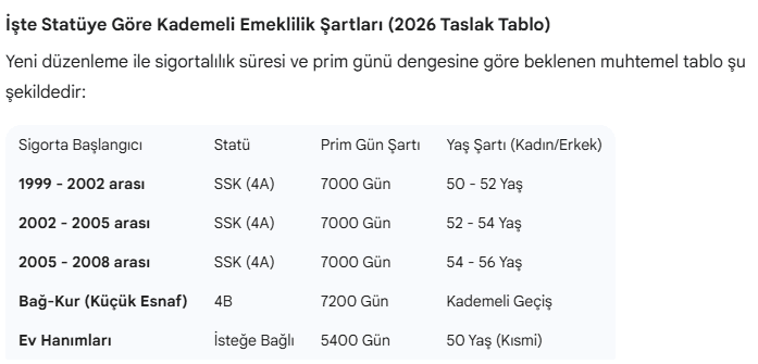 EYT düzenlemesi ile yaş şartı kalkarken, bir gün veya bir ay farkla bu hakkı kaçıranlar için “kademeli emeklilik” modeli üzerinde teknik çalışmalar sürüyor. 2026 yılına girilmesiyle birlikte torba yasa beklentileri artarken, özellikle 2000 sonrası sigorta girişi olan SSK ve Bağ-Kur’lular için yaş şartının esnetilmesi planlanıyor.