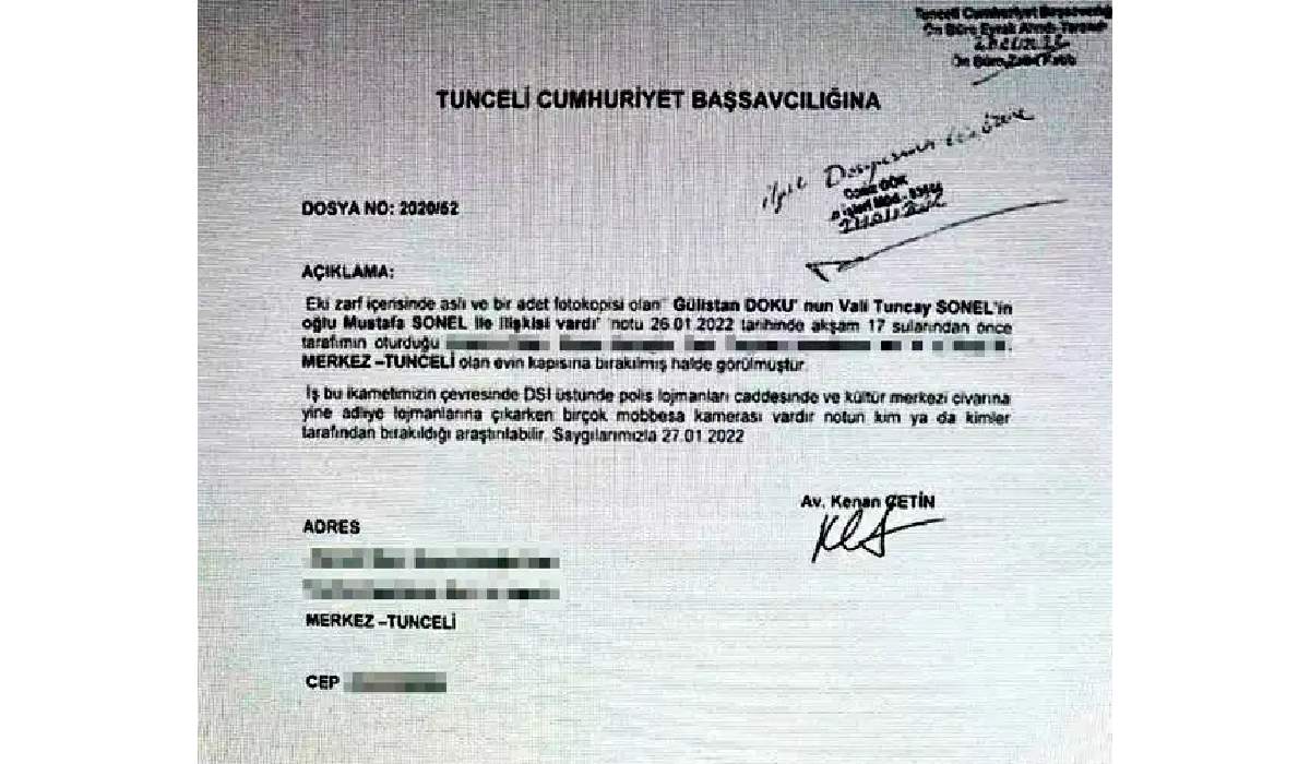 Buna göre dönemin Tunceli Barosu Başkanı Kenan Çetin’in şehirde bulunan evinin kapısına 26 Ocak 2026 akşamı bir not bırakıldı. Notta “Gülistan Doku’nun Vali Tuncay Sonel’in oğlu Mustafa Sonel ile ilişkisi vardı” ifadeleri yazıldı.