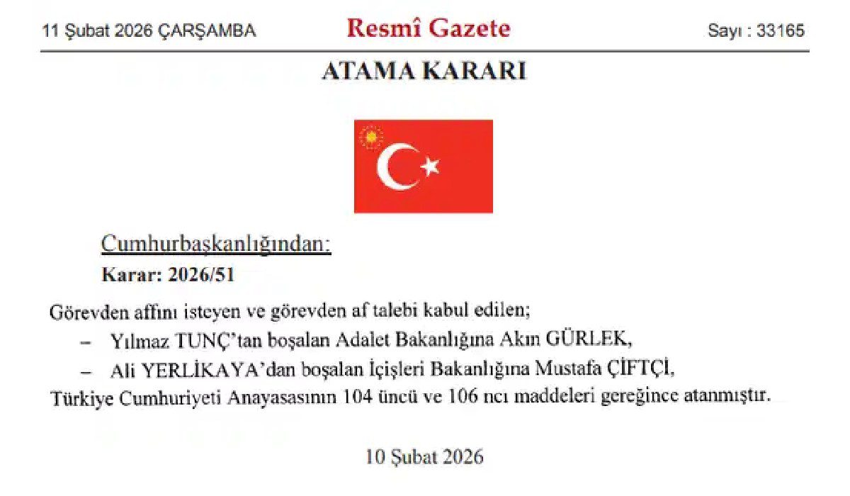 Resmi Gazete’de yayımlanan kararlara göre, Adalet Bakanı Tunç ve İçişleri Bakanı Yerlikaya görevlerinden alındı.