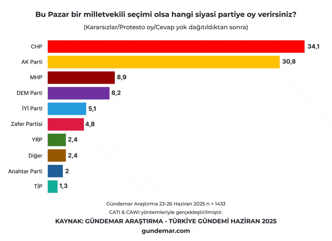 Araştırmada CHP’nin oy oranının yüzde 34,1, AK Parti’nin oy oranının da yüzde 30,8 olduğu görüldü.