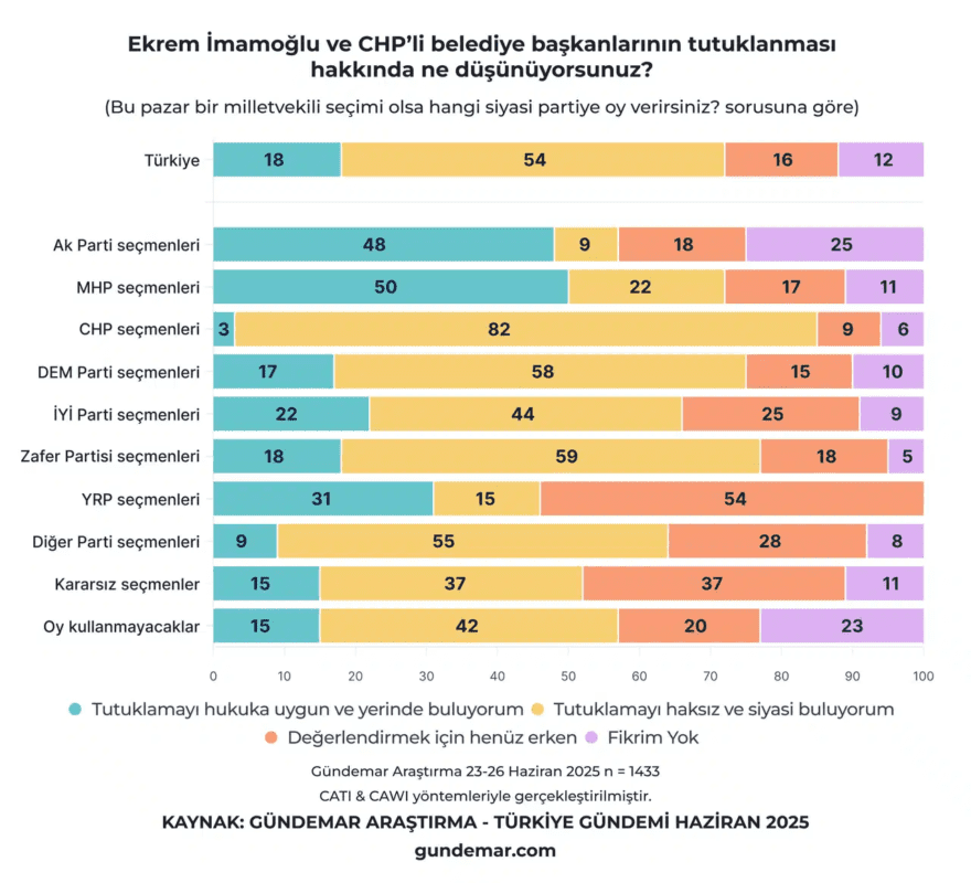 Gündemar Araştırma’nın Türkiye genelinde yaptığı son araştırmada CHP belediyelerine yönelik hızlanan gözaltı ve tutuklamalara rağmen toplumun yarısından fazlası (yüzde 54’ü) “tutuklamaları haksız ve siyasi buluyorum” dediği, yalnızca yüzde 18’inin ise “tutuklamayı hukuka uygun ve yerinde buluyorum” dediği görüldü.