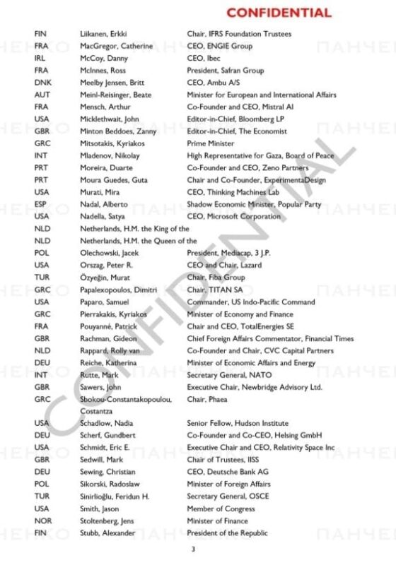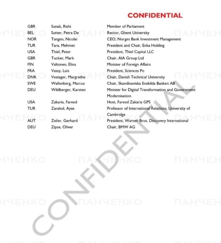 Dicks’in paylaştığı listede Türkiye’den iş insanları Ali Koç, Mehmet Tara ve Murat Özyeğin’in yanı sıra Dışişleri eski Bakanı Feridun Sinirlioğlu ile akademisyen Ayşe Zarakol da bulunuyor. Katılımcılar; finans, teknoloji, savunma ve NATO çevreleri, enerji sektörü, medya ve siyaset gibi alanlarda etkili isimlerden oluşuyor.