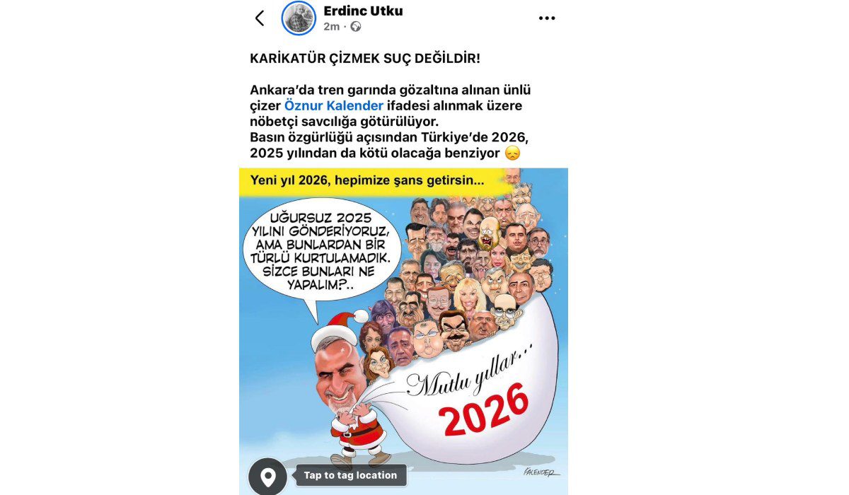 Çizer Öznur Kalender, yılbaşı temasıyla çizdiği bir karikatürü nedeniyle Ankara Tren Garı’nda gözaltına alındı.