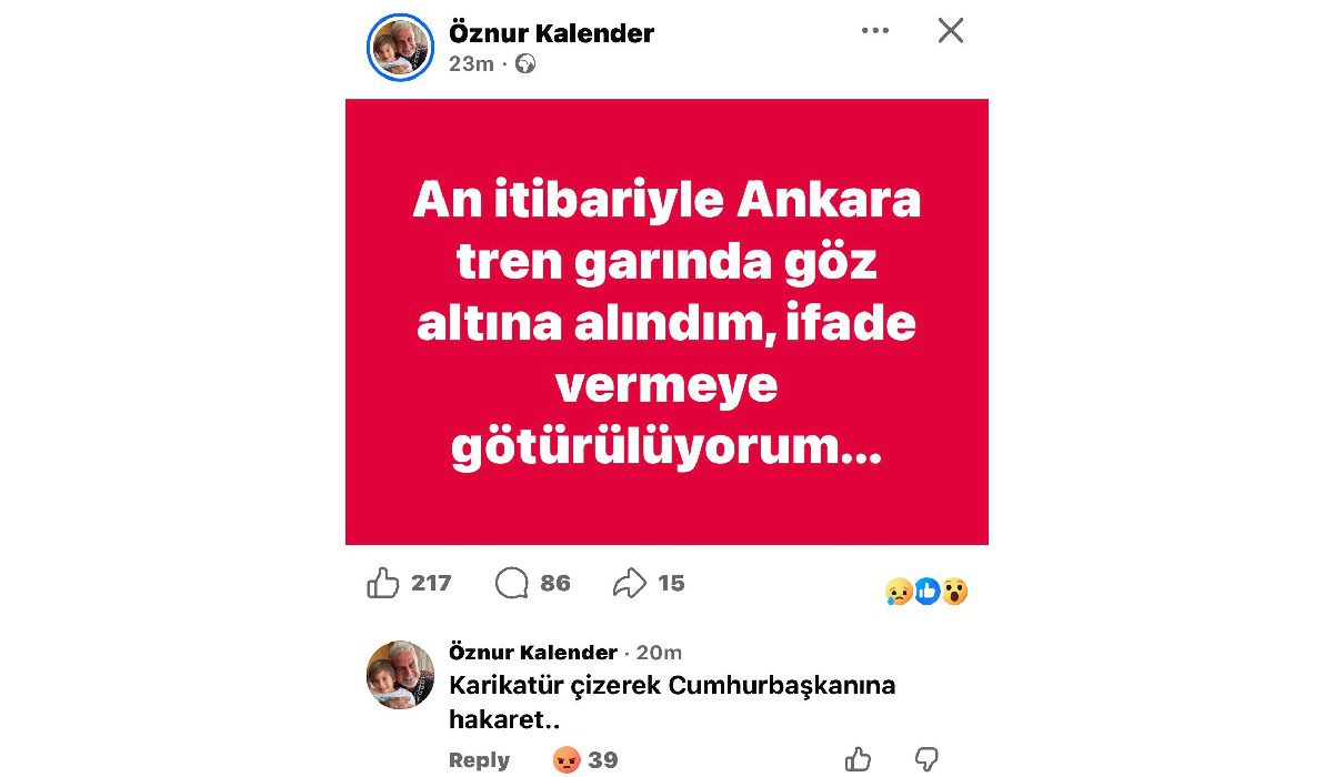 Gözaltına alınışını sosyal medya hesabından duyuran Kalender; “Karikatür çizerek Cumhurbaşkanı’na hakaretten” gözaltına alındığını ve nöbetçi mahkemeye çıkarıldığını açıkladı.