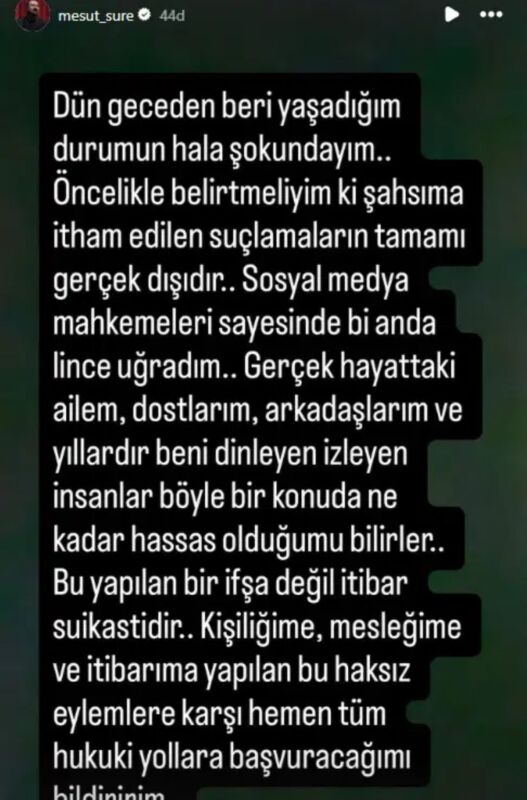 Mesut Süre, anlatılanlara ilişkin Instagram üzerinden açıklama yaptı ve taciz iddialarını reddetti.