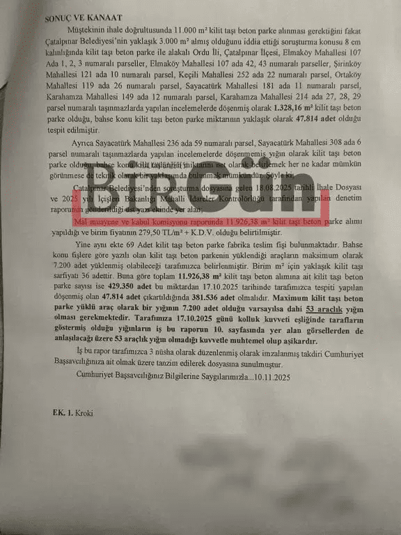 BirGün’ün ulaştığı bilirkişi raporunda, yollara döşenen ve yığın olarak bekletilen 11.926 m2’lik alanı kapsayacak yaklaşık 429.350 adet beton parke taşının Çatalpınar’da olmadığı net bir şekilde ortaya konuldu.