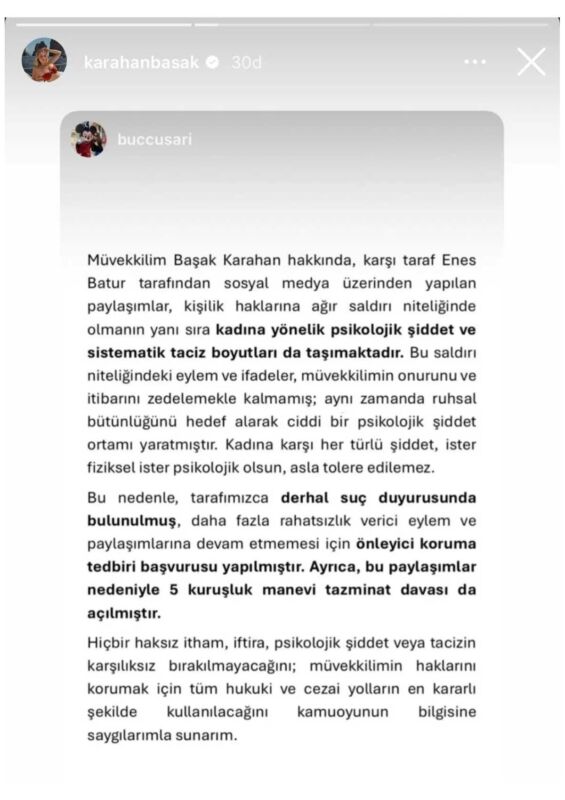 Karahan, Instagram hesabından avukatının yazılı açıklamasını paylaşarak gelişmeyi duyurdu. Açıklamada, Enes Batur’un son dönemde yaptığı paylaşımların “kadına yönelik psikolojik şiddet ve sistematik taciz boyutları taşıdığı” ifade edildi.