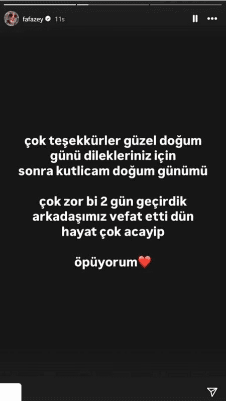 Paylaşımının devamında kutlamayı erteleme sebebini açıklayan ünlü oyuncu “Çok zor bir 2 gün geçirdik, arkadaşımız vefat etti dün. Hayat çok acayip” ifadelerini kullandı.