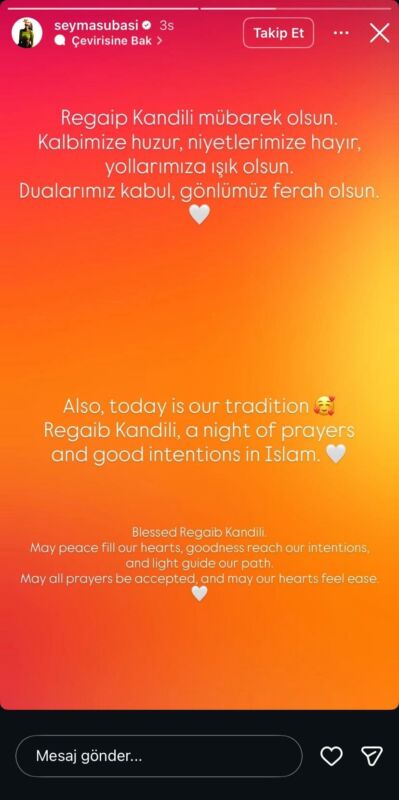 Şeyma Subaşı, hikaye kısmında kandil mesajı yayımlayarak, “Regaip Kandili mübarek olsun. Kalbimize huzur, niyetlerimize hayır, yollarımıza ışık olsun. Dualarımız kabul, gönlümüz ferah olsun” notunu düştü.