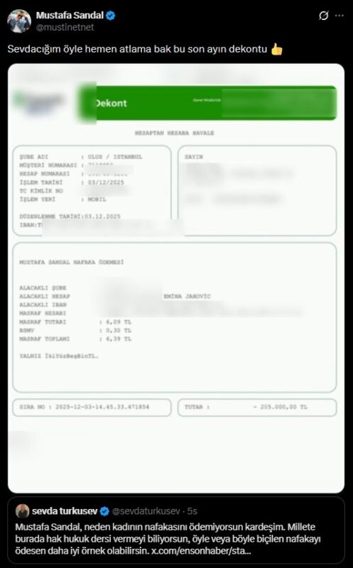 Mustafa Sandal ise kendisine yöneltilen “Nafakanı neden ödemiyorsun?” eleştirilerine sosyal medya hesabından yanıt verdi. Sandal, 3 Aralık’ta ödediğini belirttiği 205 bin liralık nafakanın dekontunu paylaşarak iddialara karşılık verdi.