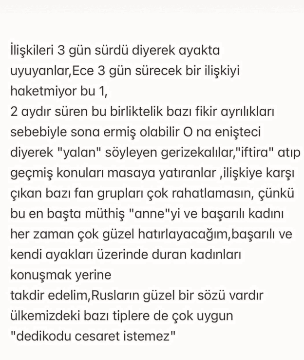 Ayrılığı doğrulayan Sinan Akçıl, Ece Erken’e övgüler yağdırırken, eleştirileri yöneltenlere de sert sözlerle yanıt verdi. “İlişkileri üç gün sürdü diyerek ayakta uyuyanlar, Ece üç gün sürecek bir ilişkiyi hak etmiyor bu 1, İki aydır süren bu birliktelik bazı fikir ayrılıkları sebebiyle sona ermiş olabilir.” diyen Akçıl, birlikteliklerinin iki aydır sürdüğünü ve bazı fikir ayrılıkları nedeniyle sona ermiş olabileceğini belirtti.