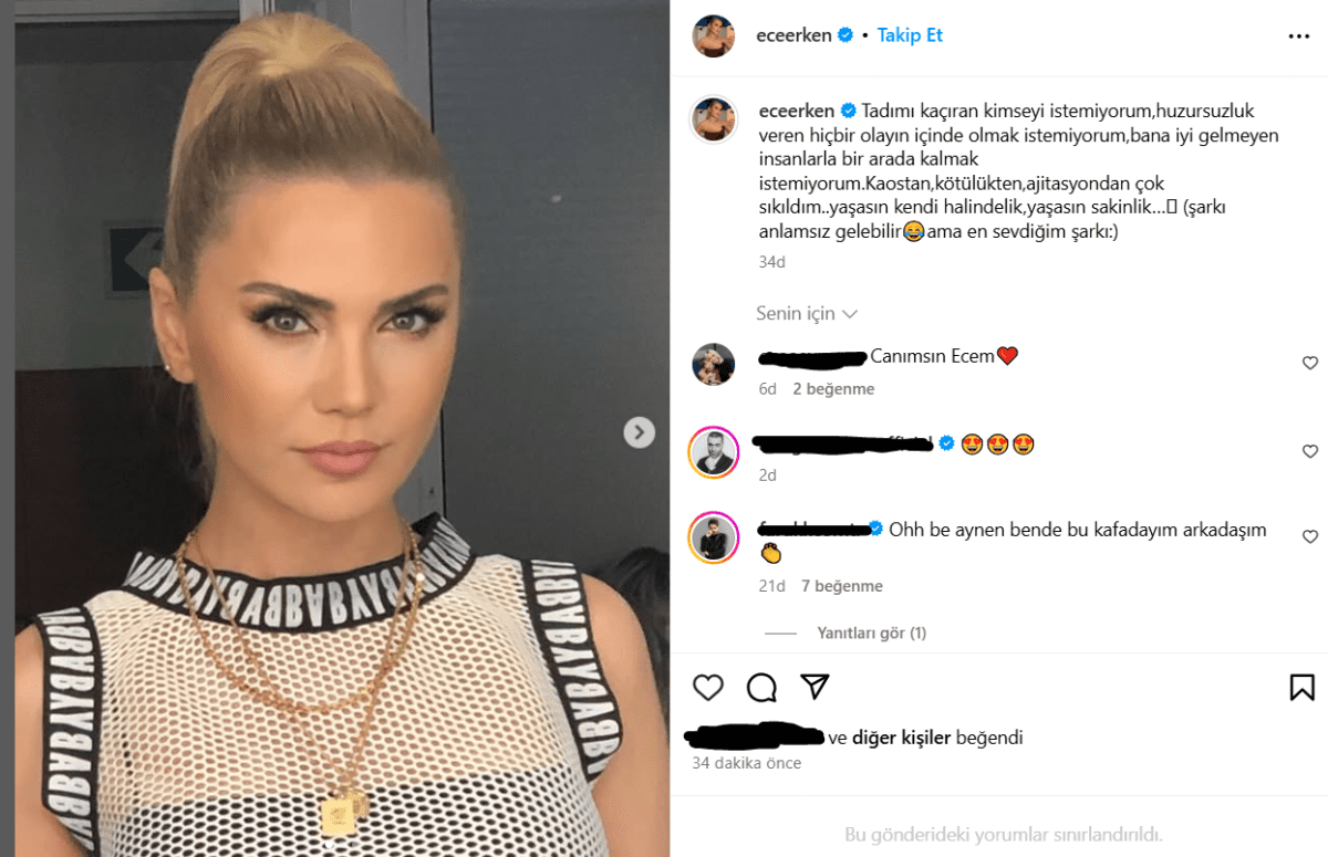 Sinan Akçıl’ın ayrılık açıklamasından sonra Ece Erken de bir paylaşım yaptı. Ünlü sunucu paylaşımında, “Tadımı kaçıran kimseyi istemiyorum,huzursuzluk veren hiçbir olayın içinde olmak istemiyorum,bana iyi gelmeyen insanlarla bir arada kalmak istemiyorum.Kaostan,kötülükten,ajitasyondan çok sıkıldım..yaşasın kendi halindelik,yaşasın sakinlik…” dedi