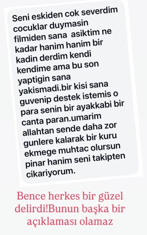 Bu paylaşım sonrası Altuğ’a bazı eleştirel mesajlar geldi. Bir takipçisi Pınar Altuğ’a “Seni eskiden çok severdim ‘Çocuklar Duymasın’da sana aşıktım ne kadar hanım bir kadın derdim kendi kendime ama bu son yaptığın sana yakışmadı. Bir kişi sana güvenip destek istemiş o para senin bir ayakkabı bir çanta paran. Umarım Allah’tan sen de daha zor günlere kalarak bir kuru ekmeğe muhtaç olursun Pınar Hanım seni takipten çıkarıyorum” sözleriyle beddua etti.