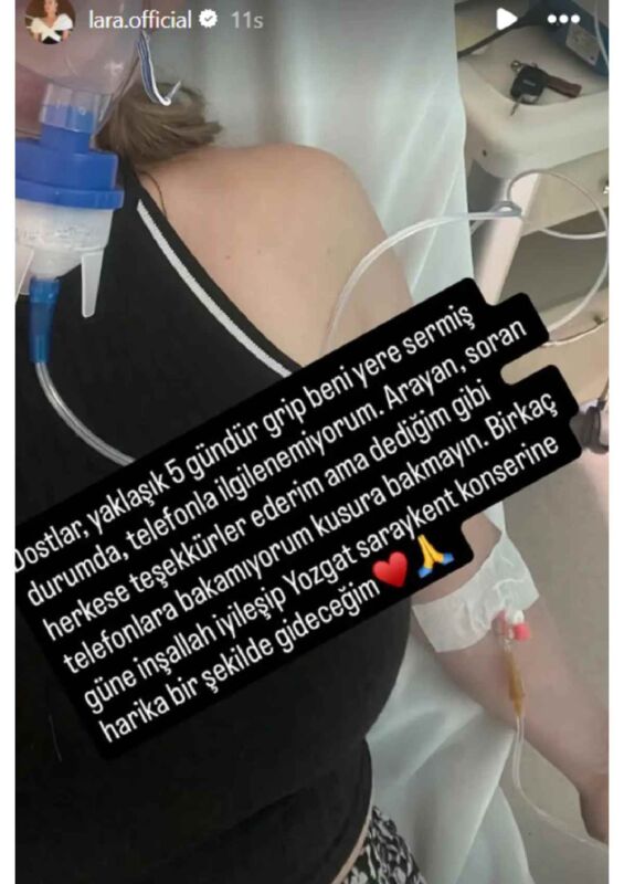 5 gündür kötü olduğunu dile getiren Lara, hastanede odasındaki fotoğrafını “Dostlar, yaklaşık 5 gündür grip beni yere sermiş durumda. Telefonla ilgilenemiyorum. Arayan, soran herkese teşekkürler ederim ama dediğim gibi telefonlara bakamıyorum kusura bakmayın. Birkaç güne inşallah iyileşip Yozgat Saraykent konserine harika bir şekilde gideceğim” ifadelerini not düştü.