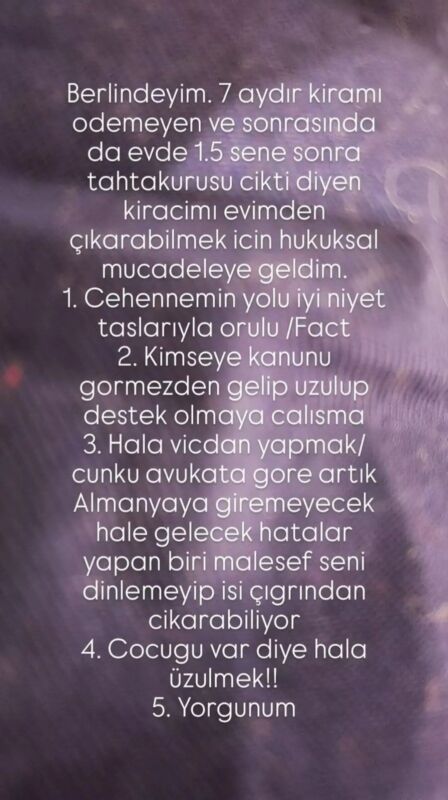 Tuba Ünsal, “Berlin’deyim. 7 aydır kiramı ödemeyen ve sonrasında da evde 1.5 sene sonra tahtakurusu çıktı diyen kiracımı evimden çıkarabilmek için hukuksal mücadeleye geldim.