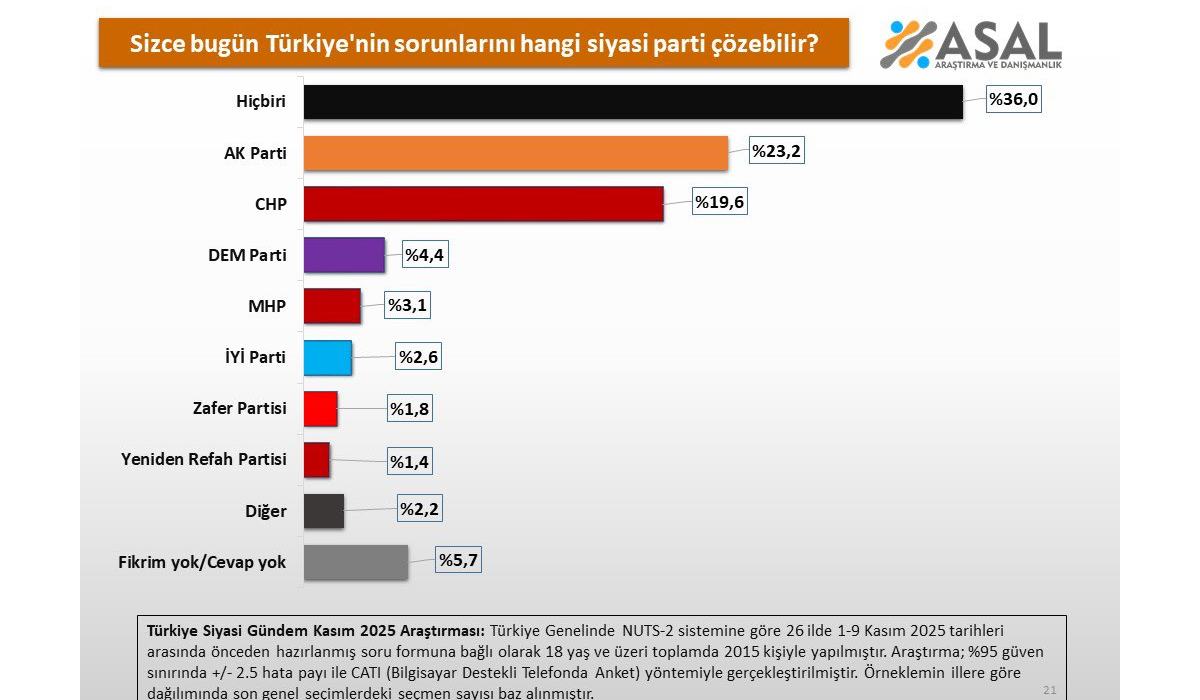 ASAL Araştırma’nın Kasım 2025 anketine göre seçmenlerin önemli bölümü siyasi partilere çözüm konusunda güven duymuyor. Katılımcıların yüzde 23,2’si AKP’yi, yüzde 19,6’sı CHP’yi çözüm adresi olarak görüyor.