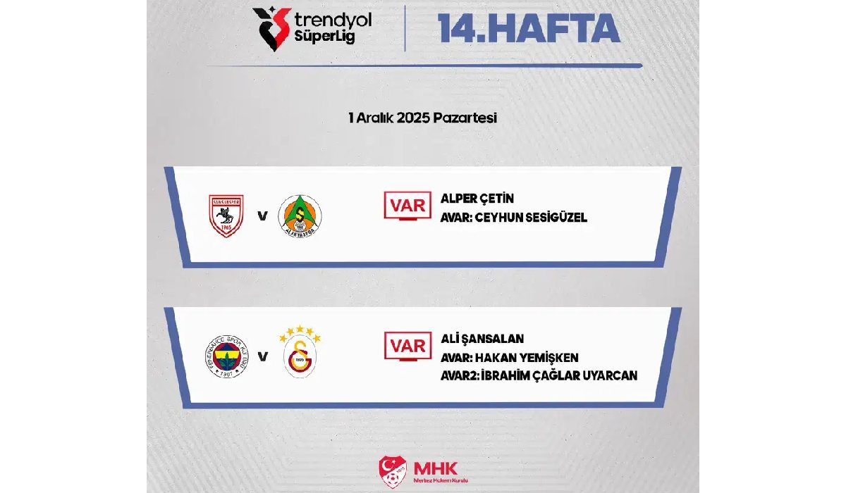 Trendyol Süper Lig’de bu akşamki maçlar öncesinde Türkiye Futbol Federasyonu, karşılaşmalarda görev alacak VAR ve AVAR hakemlerini duyurdu.