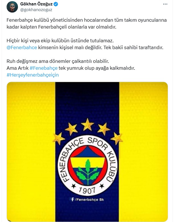 “Fenerbahçe kulübü yöneticisinden hocalarından tüm takım oyuncularına kadar kalpten Fenerbahçeli olanlarla var olmalıdır” diyen Özoğuz’un paylaşımı şu şekilde: