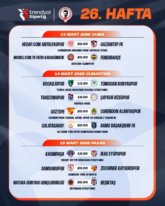 “Trendyol Süper Lig Mehmet Ali Yılmaz Sezonu 26-27. hafta müsabakalarına ilişkin program açıklanmıştır.