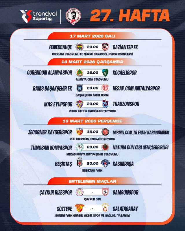 21.01.2026 tarihinde Trendyol Süper Lig 27. hafta müsabakalarının tarihlerinde değişiklik yapıldığına ilişkin açıklamada belirtildiği üzere, Galatasaray ve Samsunspor kulüplerimizin UEFA Şampiyonlar Ligi ve UEFA Konferans Ligi’nde Son 16 Turuna yükselmiş olmalarından dolayı, Göztepe – Galatasaray ile Çaykur Rizespor – Samsunspor Trendyol Süper Lig 27. Hafta müsabakaları ileri bir tarihe ertelenmiştir.
