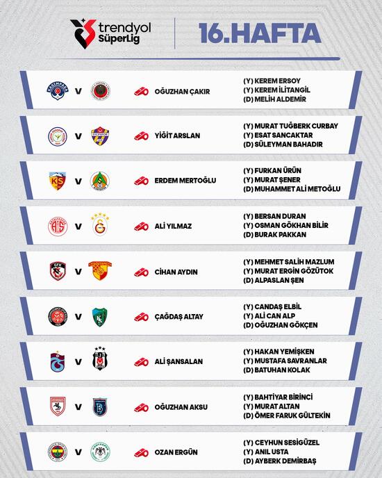 Trendyol Süper Lig’de 16. hafta maçlarının hakemleri belli oldu.
