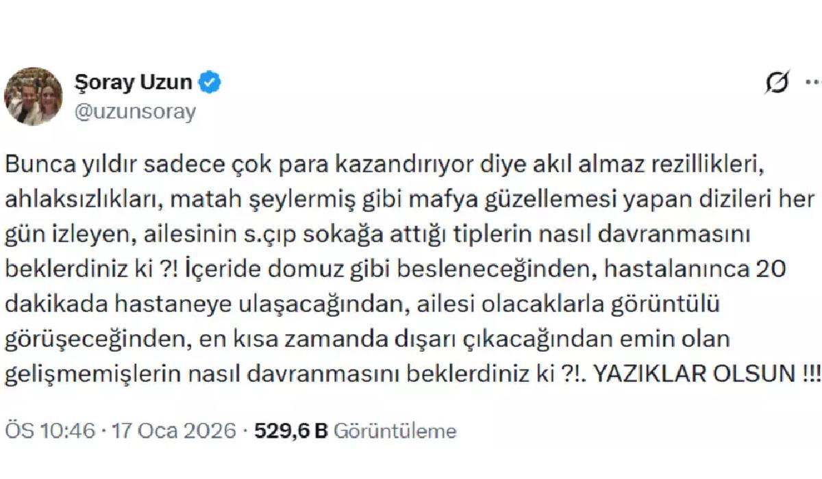 “Seksenler” dizisindeki rolüyle tanınan oyuncu ve sunucu Şoray Uzun da yaşananlara sert bir paylaşımla tepki gösterdi. Uzun, mesajında şiddeti ve mafya kültürünü normalleştiren yapımlara dikkat çekerek şu ifadeleri kullandı: