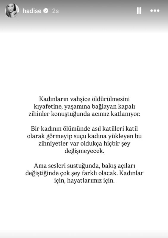 Instagram hesabından paylaşım yapan Hadise, kadın cinayetlerine yönelik sert bir tepki göstererek “Acımız katlanıyor” dedi.