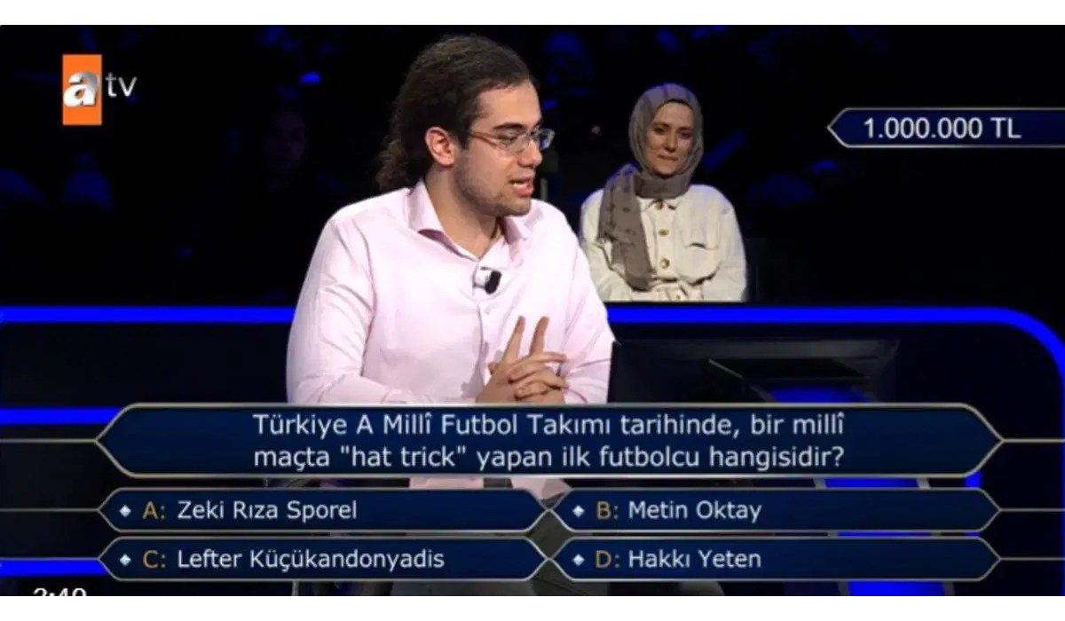 Yarışmacıya, “Türkiye A Millî Futbol Takımı tarihinde bir maçta hat-trick yapan ilk futbolcu kimdir?” sorusu yöneltildi. Şıklarda Türk futbolunun önemli isimleri yer aldı. Bir süre düşünen yarışmacı, kesin emin olamayınca risk almadı.
